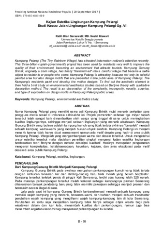 Saraswati, Ratih Dian and Kiswari, Maria Damiana Nestri (2017) Kajian Estetika Lingkungan Kampung Pelangi Studi Kasus: Jalan Lingkungan Kampung Pelangi Gg. VI. In: Seminar Nasional Arsitektur Populis.