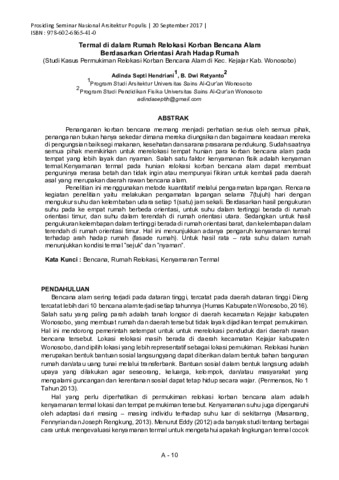 Hendriani, Adinda Septi and Retyanto, B. Dwi (2017) Termal di Dalam Rumah Relokasi Korban Bencana Alam Berdasarkan Orientasi Arah Hadap Rumah (Studi Kasus Permukiman Relokasi Bencana Alamdi Kec. Kejajar Kab. Wonosobo). In: Seminar Nasional Arsitektur Populis.