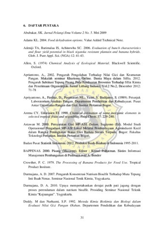 Indonesia merupakan negara yang memiliki sumber daya alam yang dapat dimanfaatkan sebagai bahan pangan sumber karbohidrat. Salah satu komoditas yang dapat dimanfaatkan adalah buah pisang. Namun buah pisang kurang dimanfaatkan secara maksimal, karena buah pisang mudah mengalami pembusukan selama masa penyimpanan. Untuk mengatasi hal tersebut, buah pisang dapat diolah menjadi tepung. Tepung pisang memilik umur simpan yang lebih lama dan lebih praktis untuk diolah menjadi produk. Salah satu produk yang dapat dihasilkan dari tepung pisang adalah bubur bayi. Dalam penelitian ini, pisang yang digunakan adalah pisang kepok. Pembuatan tepung pisang dilakukan dengan pengeringan dan penepungan. Pengeringan pisang dilakukan dengan menggunakan oven, pada beberapa suhu pengeringan. Suhu pengeringan yang digunakan pada penelitian ini adalah 60oC, 70oC, dan 80oC. Analisa yang dilakukan pada penelitian ini antara lain analisa proksimat, kadar pati, warna, water holding capacity (WHC), water activity (Aw), uji seduh, dan waktu rehidrasi. Kemudian, tepung pisang diolah menjadi bubur bayi. Bubur bayi dipilih karena pisang merupakan sumber karbohidrat. Pada bubur bayi dilakukan uji organoleptik dengan panelis ibu-ibu. Hasil penelitian menunjukkan bahwa suhu pengeringan 60oC memiliki hasil paling tinggi dalam kandungan protein, lemak, dan pati. Kemudian, suhu pengeringan 80oC memberikan hasil paling tinggi pada kandungan karbohidrat, amilosa, serta memiliki kandungan air paling rendah. Bubur bayi yang dihasilkan dari tepung pisang dapat memenuhi standar kalori yang ada. Dari hasil uji organoleptik, bubur bayi yang dibuat dari tepung pisang dengan suhu pengeringan 80oC memiliki tingkat penerimaan paling tinggi.