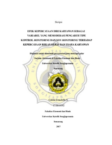 Penelitian ini bertujuan untuk menguji pengaruh penerapan tipe kontrol monitoring dan non monitoring terhadap kepercayaan rekan kerja dan usaha karyawan. Variabel dependen yang digunakan dalam penelitian ini adalah tipe kontrol monitoring dan non monitoring ,variabel dependen ini tidak diukur melainkan dengan pemberian adanya treatmen pada desain eksperimen. Sedangkan variabel idependen dalam penelitian ini adalah kepercayaan rekan kerja dan usaha karyawan. Terdapat variabel moderasi dalam penelitian ini yaitu kepercayaan diri karyawan. Dalam desain eksperimen kepercayaan diri karyawan dikelompokan menjadi 2 kategori yaitu tinggi dan rendah. Penelitian ini merupakan replikasi dari penelitian yang dilakukan oleh Jace Garret (2015) dengan mempertimbangan tipe kontrol kedalam penelitian ini. Sampel penelitian ini adalah mahasiswa Universitas Katolik Soegijapranata Semarang yang dipilih tanpa adanya kriteria khusus dalam mengikuti eksperimen. Data dianalisis menggunakan uji MRA dengan anova. Hasil penelitian menunjukan bahwa terdapat pengaruh antara adanya tipe kontrol dan kepercayaan diri karyawan terhadap kepercayaan rekan kerja dan usaha karyawan. Karyawan yang tidak dikontrol monitoring (non monitoring) memiliki kepercayaan rekan kerja lebih tinggi bagi kepercayaan diri karyawan tinggi dibandingkan ketika diberikan kontrol monitoring. Karyawan yang dikontrol monitoring memiliki usaha karyawan lebih tinggi bagi kepercayaan diri karyawan rendah dibandingkan dengan non monitoring