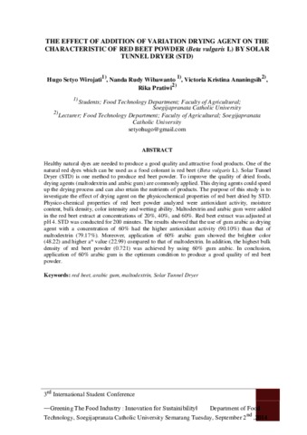 WIROJATI, HUGO SETYO and WIBAWANTO, NANDA RUDY and Ananingsih, Kristina and Pratiwi, Alberta Rika The Effect of Addition of Variation Drying Agent on The Characteristic of Red Beet Powder (Beta vulgaris L) by Solar Tunnel Dryer (STD). 3rd International Student Conference on Food Science and Technology “Greening the Food Industry: Inovation for Sustainability”. ISSN 978-602-8011-81-5