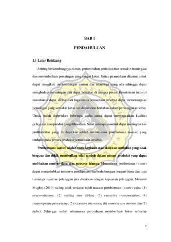Kristanti, Olivia Imaniar (2017) RANCANGAN MINIMASI PEMBOROSAN (WASTE) DENGAN MENGGUNAKAN VALUE STREAM MAPPING TOOLS (STUDI KASUS PADA CV. HARUM SEJAHTERA). Other thesis, Unika Soegijapranata Semarang.