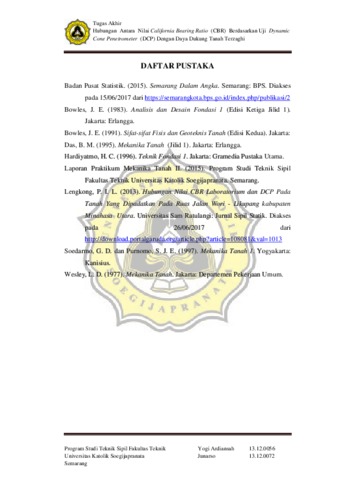 ARDIANSAH, YOGI (2018) HUBUNGAN ANTARA NILAI CALIFORNIA BEARING RATIO (CBR) BERDASARKAN UJI DYNAMIC CONE PENETROMETER (DCP) DENGAN DAYA DUKUNG TANAH TERZAGHI. Other thesis, Unika Soegijapranata Semarang.