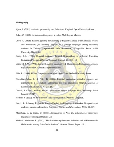 This is a study of parents‟ attitude toward their children achievement in a bilingual school. This study is conducted to find out what motivate parents to choose bilingual program schools for their children and to investigate how parents feel about their children's educational and linguistic achievements. The study was a quantitative study using-questionnaire to collect data from 50 parents of elementary school students. The descriptive statistic was used to get the means. The result shows that 14 items filled in by 15 respondents have favorable attitude with the means above 3.3. It means that they believe that by sending their children to immersion program, some benefits can be gained. However, one item shows that the respondents have unfavorable attitude because the sentence was negative. The qualitative data taken from the interview with five respondents highlighted some points which support the idea that English language is important and can prepare for the bright future