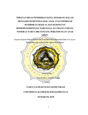 Tarigan, Gracelia Retno Alvionita (2018) PERANAN DINAS PENDIDIKAN KOTA SEMARANG DALAM MENJAMIN PEMENUHAN HAK ANAK ATAS INFORMASI PENDIDIKAN SEKSUAL DAN KESEHATAN REPRODUKSIDITINJAU DARI PASAL 10 UNDANG-UNDANG NOMOR 23 TAHUN 2002 TENTANG PERLINDUNGAN ANAK. Other thesis, Unika Soegijapranata Semarang.