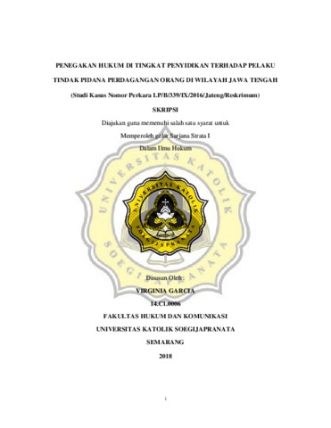 GARCIA, VIRGINIA (2018) PENEGAKAN HUKUM DI TINGKAT PENYIDIKAN TERHADAP PELAKU TINDAK PIDANA PERDAGANGAN ORANG DI WILAYAH JAWA TENGAH (Studi Kasus Nomor Perkara LP/B/339/IX/2016/Jateng/Reskrimum). Other thesis, Unika Soegijapranata Semarang.