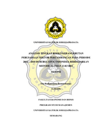 Kusumohardjo, Eka Rudiputranta (2018) ANALISIS TINGKAT RISIKO KEBANGKRUTAN PERUSAHAAN SEKTOR PERTAMBANGAN PADA PERIODE 2012 – 2016 DI BURSA EFEK INDONESIA BERDASARKAN METODE ALTMAN Z-SCORE. Other thesis, Unika Soegijapranata Semarang.