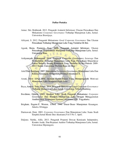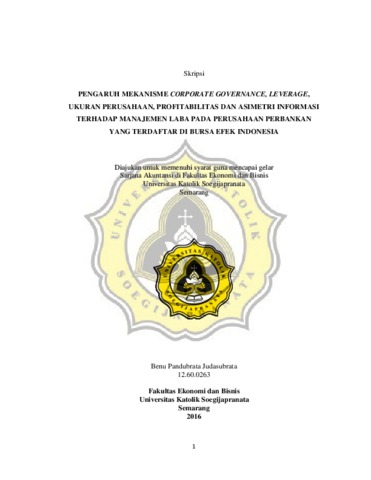 Judasubrata, Benu Pandubrata (2018) PENGARUH MEKANISME CORPORATE GOVERNANCE, LEVERAGE, UKURAN PERUSAHAAN, PROFITABILITAS DAN ASIMETRI INFORMASI TERHADAP MANAJEMEN LABA PADA PERUSAHAAN PERBANKAN YANG TERDAFTAR DI BURSA EFEK INDONESIA. Other thesis, Unika Soegijapranata Semarang.