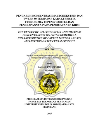 SAPUTRA, DANANG DWI (2018) PENGARUH KONSENTRASI MALTODEKSTRIN DAN TWEEN 80 TERHADAP KARAKTERISTIK FISIKOKIMIA TEPUNG WORTEL DAN PENERAPANNYA PADA PEMBUATAN ES KRIM. Other thesis, Unika Soegijapranata Semarang.