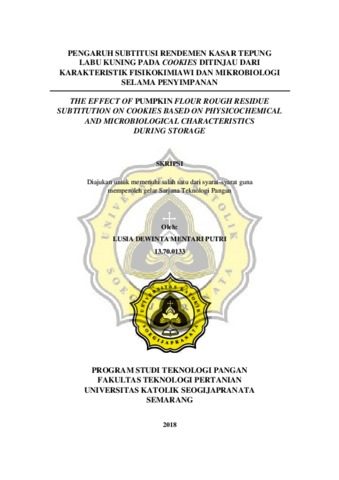 PUTRI, LUSIA DEWINTA MENTARI (2018) PENGARUH SUBTITUSI RENDEMEN KASAR TEPUNG LABU KUNING PADA COOKIES DITINJAU DARI KARAKTERISTIK FISIKOKIMIAWI DAN MIKROBIOLOGI SELAMA PENYIMPANAN. Other thesis, Unika Soegijapranata Semarang.