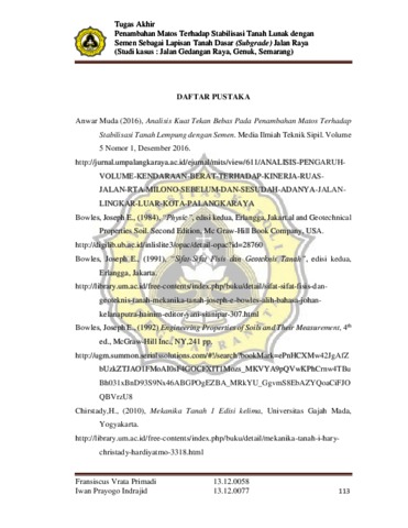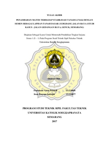 Primadi, Fransiscus Vrata (2018) PENAMBAHAN MATOS TERHADAP STABILISASI TANAH LUNAK DENGAN SEMEN SEBAGAI LAPISAN TANAH DASAR (SUBGRADE) JALAN RAYA (STUDI KASUS : JALAN GEDANGAN RAYA, GENUK, SEMARANG). Other thesis, Unika Soegijapranata Semarang.
