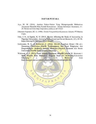 Penelitian ini bertujuan untuk mengetahui faktor-faktor yang mempengaruhi mahasiswa untuk mengambil program studi akuntansi di Universitas Katolik Soegijapranata Semarang. Penelitian ini memberikan manfaat bagi penulis, pembaca serta bagi UNIKA Soegijapranata sendiri untuk masukan dalam melakukan promosi Universitas. Pada penelitian ini, penulis mengacu pada jurnal dari Amerti Irvin Widowati, Surjawati. Terdapat 3 faktor yang mempengaruhi mahasiswa dalam mengambil program studi akuntansi dari jurnal Amerti Irvin Widowati, Surjawati yaitu faktor personal, rekomendasi dan pekerjaan. Penulis mengembangkan penelitian ini dengan menemukan faktor lain diluar penelitian Amerti Irvin Widowati, Surjawati. Penemuan faktor lain tersebut didapat dari kuesioner terbuka yang diisi oleh mahasiswa akuntansi aktif angkatan 2013 sampai angkatan 2017. Mahasiswa tersebut merupakan sampel (285 mahasiswa) dari penelitian ini yang dipilih berdasarkan kriteria tertentu (purposive sampling). Alat yang digunakan penulis untuk mengumpulkan data menggunakan kuesioner yang dibagikan secara langsung kepada mahasiswa dan menggunakan google form yang disebarkan melalui aplikasi Line, Instagram dan BBM. 3 Teknik yang digunakan penulis untuk menganalisis data yaitu teknik reduksi, display data dan verifikasi serta kesimpulan. Hasil dari penelitian ini menujukan bahwa terdapat 3 faktor utama dan 3 faktor lain yang mempengaruhi pengambilan keputusan mahasiswa dalam mengambil program xv studi akuntansi di UNIKA Soegijapranata. 3 faktor utama terdiri dari faktor personal, faktor rekomendasi dan faktor pekerjaan. 3 faktor lain terdiri dari faktor budaya, ekonomi dan agama. Namun faktor lain tersebut hanya merupakan faktor kecil tidak seperti faktor personal, rekomendasi dan pekerjaan karena faktor lain ini muncul dari pendapat mahasiswa yang relatif sedikit.