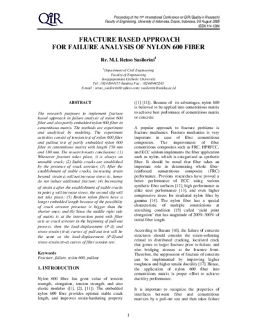 The research purposes to implement fracture based approach in failure analysis of nylon 600 fiber and also partly embedded nylon 600 fiber in cementitious matrix. The methods are experiment and analytical by modeling. The experiment activities consist of tension test of nylon 600 fiber and pullout test of partly embedded nylon 600 fiber in cementitious matrix with length 150 mm and 180 mm. The research meets conclusions: (1) Whenever fracture takes place, it is always an unstable crack; (2) Stable cracks are established by the presence of crack arrester; (3) After the establishment of stable cracks, increasing strain beyond strain 1 will not increase stress 1 , hence do not induce additional fracture; (4) Increasing of strain after the establishment of stable cracks in point g will increase stress, the second slip will not take place; (5) Broken nylon fibers have a longer embedded length because of the possibility of crack arrester presence is bigger than the shorter ones; and (6) Since the middle right side of matrix is at the intersection point with fiber acts as crack arrester in the beginning of pull-out process, then the load-displacement and stress-strain curves of pull-out test will be the same as the load-displacement and stress-strain curves of fiber tension test.