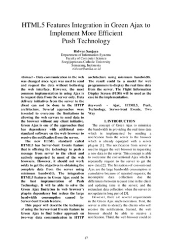 Sanjaya, Ridwan (2014) HTML5 Features Integration in Green Ajax to Implement More Efficient Push Technology. The International Journal of the Computer, the Internet and Management, 22 (1). pp. 17-22. ISSN 0858-7027