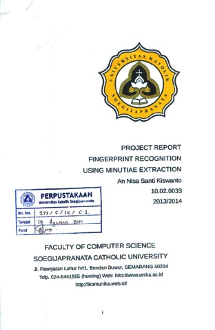 Kiswanto, An Nisa Santi (2013) FINGERPRINT RECOGNITION USING MINUTIAE E XTRACTION. Other thesis, Unika Soegijapranata Semarang.