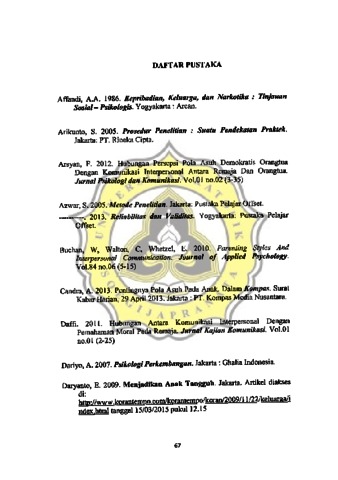 Penelitian ini bertuj uan untuk mengetahui hubungan antara pola asuh delnokratis orang tua dengan kern 1-npuan komunikasi interpersonal pada relnaja. Hipotesis yang diajukan da/am penelitian ini adalah Ada hubungan posit(f antara pola asuh demokratis orang tua engan kemampuan komuniKasi interpersonal pada remaj a. Subyek ya g digunakan da/am penelitian adalah remaja akhir berusia 18-21 tahun. Teknik pengambilan samAel menggunakan incidental sampling. Alat ukur dalam penelitian ini menggunakan skala komunikasi interpersonal dan skala pola suh demokratis orang tua. Metode anaUsis data da/am l?enelitian ini menggunakan korelasi Product M07nent. Berdasarkan hasil perhitungan Product Moment diperoleh nilai kore/asi rxy sebesar 0,407 dengan sig = 0, 000 (p<O, OJ). Hasil tersebut menunjukkan adanya hubungan positifyang signifikan antara pola asuh demokratis orang tua qengan kemampuan komunikasi interif?ersonal pada remaja pada lfarang Taruna Bangetayu Kulon Semarang.