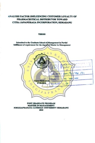 MEDYAWATI, VIANA (2010) ANALYSIS FACTOR INFLUENCING CUSTOMER LOYALTY OF HARMACEUTICAL DISTRIBUTOR TOWARD CITRA JANANURAGA INCORPORATION, SEMARANG. Masters thesis, Unika Soegijapranata Semarang.