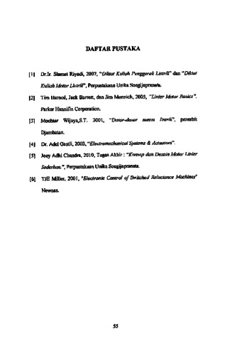 Motor switch reluctance merupakan salah satu molar yang hanyak dikemhangkan .mat ini. M%r switch reluctance sanga/ ejisien digunakan da/am herhagai hidallg. SWllc/t reluctance merupakan /ipe molor smkron vang memiliki heherapa ke/ehihan seperti slruklur YOlig sederhana dengan konstruksi tanpa belitan di sisi rotor. Sehingga membual motor switch reluclance memiliki kelahanan yang lehih haik dari pada molar DC konvesional lainya. Hal tersebut membual hiaya perawalan motor switch reluctance lerhilang murah. Motor linier switch reluclance merupakan pengemhangan dari molor switch reluctance. Peman/aalan nyata lerhadap jenis molor ini meliputi alat transportasi masal kereta maglev, konveyor pada bidang industri, dll. Pada laporan /ugas akhir ini dibual desain dan menganalisa hagaimana molor linier switch reluclance hekerja menyerupai kere/a maglev. Motor Iinier yang dibuat memiliki 6 rolor dan 8 stator. Kerela ( mover) lerhual dari bahan akrilik yang mudah dibentuk dan pada bag ian bawah diberi lempengan besi sebanyak 6 buah dengan jarak yang telah ditentukan. Slalor untuk menggerakkan kerela secara Iranslasi menggunakan /ililan kawat tembaga. Kemudian disisi pengontroJan menggunakan mikrokonlroler PIC 18F4550. Mikro mendapat inpul dari optocoupler H21A3 sebagai sensor keheradaan mover. Dengan demikian Mikrokontroler PIC 18F4550 dapat memberi perintah pengaklifan stator sehingga mover dapal hergerak. Kata kunci : Motor switch reluctance, linier, optocoupler H21 A3, PIC 18/4550