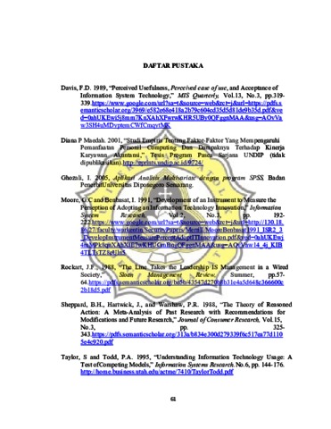 Penelitian ini menguji analisis faktor-faktor yang mempengaruhi minat pemanfaatan sistem informasi dan penggunaan sistem informasi akuntansi pada pasar swalayan di Kota Blora. Penelitian ini dilakukan pada a perusahaan-perusahaan yang ada di kota Blora. Kuesioner yang kembali dan dapat diolah sebanyak 100 kuesioner. Metode analisis data yang digunakan adalah analisis regresi berganda. Hasil dari penelitian adalah ekspektasi kerja mempunyai pengaruh positif signifikan terhadap penggunaan sistem informasi, Sedangkan ekspektasi usaha dan faktor sosial tidak mempunyai pengaruh signifikan terhadap penggunaan sistem informasi. Kondisi- kondisi yang memfasilitasi pemakai, dan minat pemanfaatan sistem informasi mempunyai pengaruh positif signifikan terhadap penggunaan sistem informasi. Kata Kunci : Ekspektasi Kerja, Ekspektasi Usaha, Faktor Sosial, Kondisi- Kondisi Yang Memfasilitasi Pemakai, Penggunaan Sistem Informasi.