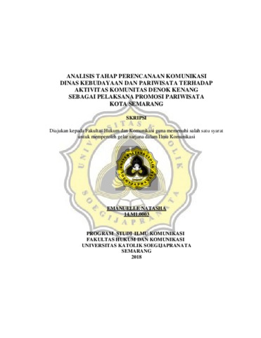 NATASHA, EMANUELLE (2018) ANALISIS TAHAP PERENCANAAN KOMUNIKASI DINAS KEBUDAYAAN DAN PARIWISATA TERHADAP AKTIVITAS KOMUNITAS DENOK KENANG SEBAGAI PELAKSANA PROMOSI PARIWISATA KOTA SEMARANG. Other thesis, Unika Soegijapranata Semarang.