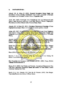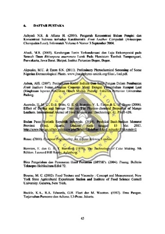 Bananas (Musa paradisiaca) are tropicaljnlits thaI are very popular and easy to obtain in Indonesia. All parts of banana plallt can be ILsed especially flesh of the fruit. However. bananas have relatively short lives and nol all bananas' prodllclion can be consumed in the form oj fresh fruit. Bananas' peels are also usually thrown away. The higher production of bananas in Indonesia causes more wasle from the peel. Therefore, 10 increase Ihe shelf life of bananas and to reduce the waste from bananas peel, banana can be processed inlo products such as fmilleather. Fruit leather is shaped similar to Ihin sheets wilh a thickness abolll 2-3 mm, water content of 15-20% with specific consistencies and flavors. The temperature and composilion of raw materials are included as faclO/'s Ihat can affect the gl'!'/!..ty of fruit leather. This sllldy aims to determine the effect of temperature aJJ4'gfhl/!o. . ion 0 flesh and bananas peel which are assessed from physi:ay;J eluo;,trhara"'i!rerisli is research, bananas from "Raja" mriety is lise ~ researcJ/ II.y:d C;omfletely Ra""";;u"mi<!'- d Design (CRD) with Iwofactors. theyar ry}'ing temperalllre (5rtC"liMfOwu/ 7~(l the composition of bananas flesh and eel (90: 10, fr20, wid ~Jf)J Orting i ' Itemperalllre was done for 8 hours ~Jcallse th valer content bas reaclu thec1iml ~Iis < 20%. The lexture meas . 'JlIls wer performed~.n a lexillre wljzer , . ness). Color memurem ~re don by IIsmg Ch iiUneier Sensory ests wer formed by hedolllc ra1l11rl metl'fd The datl, » e ~C'$fed by usm~ t:.o IV. _ :4NOVA with 95% confiden el'evel (s~gnificallce 0,0 Jo.Qi!,JP.m the effeCl~paranr er The result showed that fltempe!lIre and ct:fllipoSlllOn "";;tJbanollu fles and p~ affected frUit leather's Ira ess Th I"~her temp'i?ratllre-aifJ concenlrptl n of ba as peel, the harder texlII fnllile the This stud)! also!Ihowed that II higher t, I )eralure and composition nw,"as "teL iha~ are ILsed in nna!ysi$ f:l fruit led(l 's color wilh chromameter I e color 01'1.:.'" (Iiglr!JIn.T!'rfJl1Iillealh s became }/i ker, beside a'" (redness) and b . ~1!.:.:.vne.ts) 7;t~li!lJ~t:sensO/ est.rreslll st the consumers prefer tire fruit lea ,~h I/(e leli1j1emlure..oj6 with com . IOn of banana flesh and peel is 90 : /0 in . )'Lcts of !olor, hird~ess~ (IIId overall. werer. in allribllles of flavollr, cJ,ell'iness, and Asile-.Ttr61l/iIh, most conSIlii. lejmit leather with Ihe lemperalilre of7(f'C and }frcom""~«...p[,.,mvl{l? sand p I is 90: 10. - Key words :jmit lealher, banana, banana peel, drying lemperature