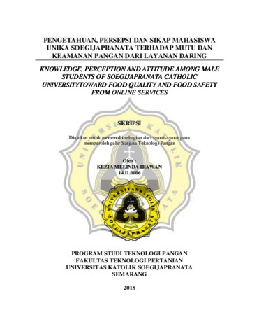 IRAWAN, KEZIA MELINDA (2018) KNOWLEDGE, PERCEPTION AND ATTITUDE AMONG MALE STUDENTS OF SOEGIJAPRANATA CATHOLIC UNIVERSITYTOWARD FOOD QUALITY AND FOOD SAFETY FROM ONLINE SERVICES. Other thesis, Unika Soegijapranata Semarang.