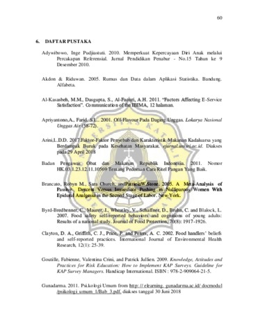 This research is done because of the growing food online delivery services. Go-food is one of the developments of Gojek (Ojek Online) which provides food delivery services. From this phenomenon, researchers want to know the knowledge, perceptions and attitudes of consumers on the Quality and Food Safety of online services. This study aims to determine the relationship between knowledge, perceptions and attitudes of students to quality and food safety. This research is divided into four major sections: literature study, preliminary survey, main survey, and relationship test. In the preliminary survey, questionnaires distributed to 20 respondents who have understood the quality and food safety of magister students and lecturers of Food Technology. The pre-survey answer was made as the Golden Standard on the main questionnaire. The answer later tested with the validity and realibility test. Having a valid and reliable question, the main survey is done by questioned98 of Unika Soegijapranata’s students. Which is then divided equally between students who live in the house and who live in boarding house. The calculation of the number of samples used in the study using the Slovin formula with the total population of active bachelor students who have been registered until the academic year 2017/2018. The main survey results were tested by descriptive test, Chi Square test, and Spearman test. Based on the results obtained, knowledge of good quality supports the perception of the good quality as well, but the knowledge of food safety has a relationship that is not in line with the perception of food security. The attitude of respondents have a direct relationship with the respondent's perception of food safety. No association was found while examining the relationship between student residence and the questionnaire. Then testof aspect of the question regardless of where the student lives.On the question of knowledge aspects of security and quality have a strong relation and on the aspect of the perception question of security and quality has found a relation.
