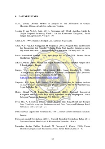 Mango (Mangifera indica L.) is a horticultural commodity that is widely developed in Indonesia. The amount of nutrients contained in the mango fruit can be very beneficial for the health of the body. Mango is a fruit that if not quickly processed will be easily damaged. To reduce the risk of damage to the fruit, fruits can be processed into a food product that can be consumed without reducing the nutritional value. One example of processed products from fruit is the jam leather. Jam leather is a jam made in the form of thin leather, has a compact texture, not sticky and elastic. Mango has a little pectin content so it needs to be added gelling agent that is carrageenan. Carrageenan serves to help the formation of a suitable texture and maintained the consistency of jam leather. The purpose of this study was to determine the effect of different carrageenan concentrations on physicochemical and sensory characteristics of mango jam leather. This research was done by making jam leather which then tested by physical, chemical and sensory characteristics. Physical characteristic test include thickness, color and texture, test of chemical characteristic include moisture content, water activity and pH. Sensory characteristic test include color attribute, adhesiveness, springiness and taste. Based on research results, it is known that carrageenan gives a real effect on the physical texture, the higher the concentration of carrageenan then the higher the level of hardness. The addition of carrageenan also significantly affect the water activity that will be higher. But the addition of carrageenan did not give a real effect on the color of mango jam leather, thickness, water content, pH and sensori from the mango jam leather.