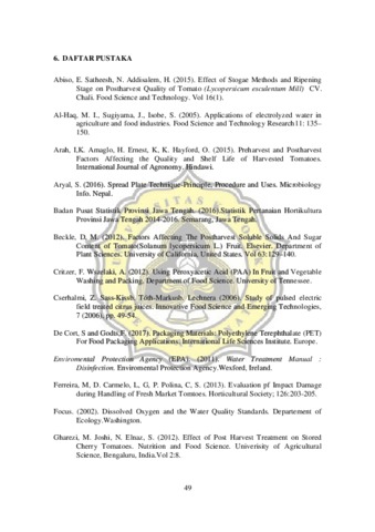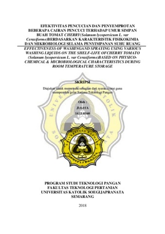 JULITA, JULITA (2018) EFFECTIVENESS OF WASHINGAND SPRAYING USING VARIOUS WASHING LIQUIDS ON THE SHELF-LIFE OFCHERRY TOMATO (Solanum lycopersicum L. var Cerasiforme)BASED ON PHYSICOCHEMICAL & MICROBIOLOGICAL CHARACTERISTICS DURING ROOM TEMPERATURE STORAGE. Other thesis, Unika Soegijapranata Semarang.