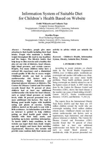 Nowadays, people give more attention to their health including their food intake. People who maintain a healthy weight throughout life tend to stay healthier and live longer. The lifestyle habits that help keep us slim exercise and a healthy diet also cut our risk of diabetes, heart disease, high blood pressure, and certain cancers. Despite, Too many children today have a reduced life expectancy and a diminished overall quality of life due to excess weight. Childhood obesity can lead to certain cardiovascular risk factors such as hypertension, high cholesterol, and abnormal glucose tolerance or diabetes. The Centers for Disease Control and Prevention recently found that 70 percent of obese children had at least one additional cardiovascular risk factor for heart disease, such as raised blood pressure or insulin levels, while 30 percent presented two or more additional risk factors. The road to lifelong good health begins with healthful eating and plenty of exercise. Getting children started on this path is easy with a little assistance. An information system base on internet is guided to help children getting an ideal health goals which is suitable with their body needs, and including up-to-date nutrition information. To knows child’s body condition, in this website can input their data (body weight, age and height) and know their nutrition requirements. Moreover, this website will provide some random daily food menus and activity to advice which are suitable for them.