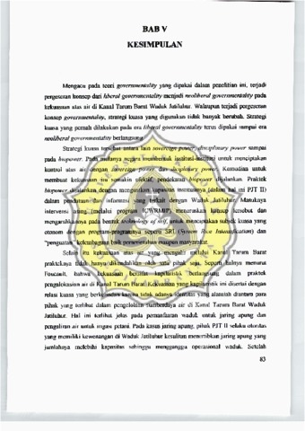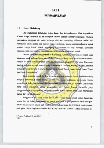 laliluhur Dam localed in Punvakarla Regency is a reservoir Ihal was built 10 serve Ihe waler needs of West lava and lakarta are alw generating eleclricity (hydropower). Along with Ihe growing needf and rising. latil"h"r drain the water through tilree artificial channels, namely the West Tarom Canal, East Tarom Canal and the North Tarom Canal. From the three channels used to drain the water, West Tarom Canal was the most diverse lise of water. West Tanon Canal channel is also pari of Ihe Citarum River. Allallager l atiluhur is l asa Tirla II Public Corporalion (P JT II). While the West Tanlm Canal which is pari of Ihe Cilarum river management under Balai Besar Wilayah Sungai (BBWS) Citarum. To meel \'arious needs, the waleI' thai flowed from the Callallaliluhur West Tarom arranged ill u waleI' allocation mechanism. In practice Ihe pawer of this mechanism OCClirs in water resources. The practice of allocation of Ihe West Tarum Canal la/iluhur is a form of p opulation control. About the allocation of water is planned to flow, showmg how power relatIOns work among Ihe actors / agencies / institutions that have an int rest in the water from the re.<ervoir through the Canal Tarum la/iluhur the Wesi. Inlerest 0/7 Ihe vater in Ihe West Tarlllll Callal become the object of siale power and mul malianal lnstitutlOns. Siale t rOllgh Its ins/itl/Ilons and foreign interests Ihrough ICWRMIP program (Inlegraled Citarum WaleI' Resources Management Improvement Plan) practice of power. GovernmenlalilY Iheory hatched by Michael ·oucault became Ihe basis (if the Iheory 10 know "How In practice QR"rating power and resistance to it take place ill the alloqation of water from Ihe West TarulII CanalJalilllhur?". Secondary and prilllaryv!ata from s urvey results in the genealogy anal siS m three stages: I) studymg the legal bo;" for \I'ater management Institutions .Iatiluhur especially in We,f1 Tontm ('01101,]) Hessing the power of the sirategy that was practiceCi in the allocation of \l'ater, 3) . Isses · Ilg the I'e~istallce tltqt lOok plocl!c in practice of power. The results >/IJhil' .I'tlld indicate Ihal the practice of power over the!f'."ocatlon (lfll'aler in Ihe West Tarum c1nul lake ' place in two phase8, nwllel liberal and neollberal go ernmentality. In Ihe )irsl phase of the dominant pOll'er In the hands ofcounmes and cl nors III t~e second phase takes over }jeans enIplwed in practicing the Rower o.f the two ph\lse.f are eqllol (with sovereign power, di ci linary pOlver and biopower. Ratiollalif2' 1.\ Sill/ the !nnst ejIeclive strategy of domination. t his sholl" Ihqt the pO\l'er reSOUrce managemenl pracliced rational \l'ay would make the sllbj ect the weI' 10 be obedient and resil'tance can be nll/tec/.