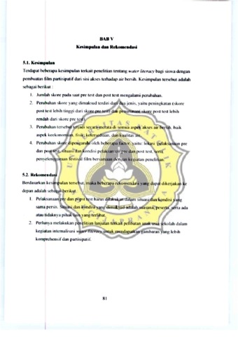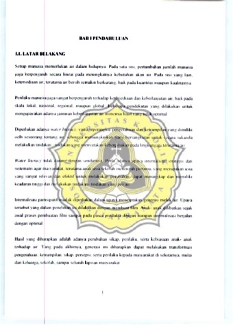 Tanpa air tldak ada saru makhlukpun dapat hidup Setiap orang di negara ini harus memili ki pelu ang yang sarna unruk dapat mengakscs air Walaupun demiki an, kenyataan menunJukk an bahwa masih te,rj adi kondi si yang paradok. Pada satu SISI, orang mi sklll tidak dapat mendapatk an I air yang balk Qan cukup Pada slsi yang lain , orang kaya banyak sekali menghasdkan Iimbah da lam pcnggun aan alrnya, mlsalnya unt uk I11nCUCI kcndaraan, memcnuh l bak kamar mandi, ko lam renang, ~e rt a banyak aklltitas lalll yang sangat membo roskan air. Untuk menlllgkatkan kesadaran masyarakat akan rur, di perluk rul II'{//er IlIem eT. Wnlcr l i leracy dapat dil akukan tidak hanya me lalUl pendidik an fomla l, melalilk an dengan media Juga. I11 lsalnya fi lm . Idealnya pengantar telll rulg ",{//er I /leraey hanls dlbcn kan kcpada anak seJak usia din l TUJuan dan penelin rul Inl ada lah untuk mengilltemali sasl water li teracy pad a pada slswa dengan pembuatan fi lm panl slpall f pada aspek akses terh adap air Pcnelitl 3l1 1111 meli ba tkan slswa SMP Karti yoso Semarang Sekolah Ini merUpak3l1 kaWaS3Il terdampak terkalt persoalan air, ml salnya b3l1JIr dan rob Dua kelompok (4 orang) dlP il lh unt uk berpa rtlslpas l dalam proses pembuat3l1 film Penellli an 1111 Ill ~ n gun ak an melhode lI 'a te r duo)' Siswa dllll1ciang untuk berp art lslpaSI dalam mengamatl segal a kcglatan han an tc rkan air dan mcnul1J ukk an baga lmana orang J11 lskin mendapatkan air be rslh . Serl ap 3Ilak melakuk3l1 pencatat 3l1 terh adap akllf'it as hanan mereka terkal t air, pada ~a at yang sama mereka melakukan pengamatan satu dengan ya ng lain terkall penlaku terhadap air Sctelah IIU , mereka membaglk an hastl pencatatan dan pengamatan kepada yang lain. Sebeluin mere ka mencatat dalam water diary , mercka terl ebih dulu mengisl pre lest kuesener I'ada pr?ses se laj utnya. kelompok 111 1 akan ro kus pad a ak ses air dan teknl k pembuatan fi lm. Modul ten tang akses air bersih dan pembuatan fi lm part islpati f di siapkan unu k me lengkapi peneltn an 1111. Berd asarkan pada modul yang ad a. se ll ap kelompo k akan membuat fi lm. Berdasa rkan pada hasil di skusi dan pengarnatan harian mereka, siswa kemudian memil ih IOpik kh usus untuk membuat film . In i berarti bahwa slswa sendln yang membuat skrip fi lm, menj adi direktur, sutradaraJ ak tri s, pengrunat, dan pengrttlk fi lm yang mereka buat Fi lm yang mereka hasilkan akan d l k ~ rJ as am ak an dengan rumah produksl pro fes lonal untuk mendapat sentuh an seperlun ya. Keti ka film sudah siap, akan dil ak ukan penyanngan gun a mendapatkan topi k yang benar- benar terkalt ci eng3l1 wa ler lilcrctq . Guna mcmperda lam lema akan dtlakukan wawan cara mendalam sebelum dan sesudah pembuatan film