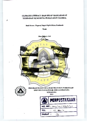 JATI, DIAN RAHAYU (2012) CLIMATE LITERACY DAN SIKAP MASYARAKAT TERHADAP FENOMENA PEMANASAN GLOBAL. Masters thesis, Unika Soegijapranata Semarang.