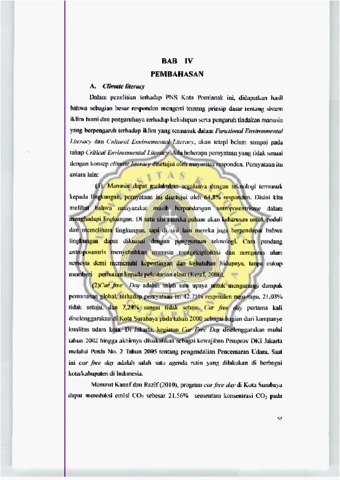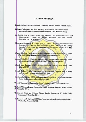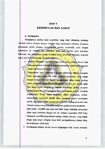 Global warming is a term heard requently and is currently associated with a variety of events and natllral disasters in the country {Indonesia}. Like from flooding, extrem~ weather, and a variety of diseases. The.,phenomenon of global warming is characterized by change's in Earth's climate and the increase in number of greenhouse gases in the atmosphere. Efforts to address this issue in Indonesia have not been done seriously. One of the reasons was the lack of understanding and knawledge about climate and its relationship with the enviranment. The porpuse of this sudy was to determine the extent of climate literacy in affecting societal attitude -in this €Use how the government employees of Pontianak City were dealing with global worming. The research was conducted by distributing questionnaires to 30 government institutions, 6 distflotS, and 4 villag s offices in Pontianok City. Correlation analysis between climate literacy and societal attitudes in dealing the phenomenon of global warming hawed a significant but weak relationship. While, based an frequency distribution some of the respondent agrreed on provisions related to climate literacy, however they failed to act in terms of actual practices. This was caused by the presence of a high understanding of climate literacy that was not accompanied by its application in daily life practices.