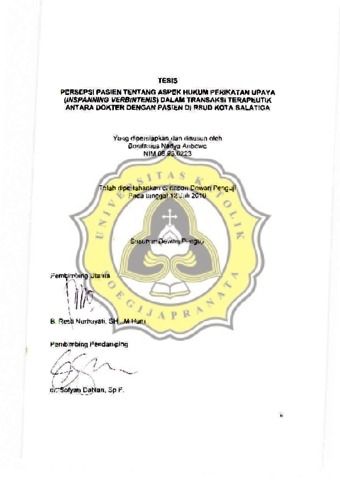ARIWIBOWO, BONIFASIUS NADYA (2010) PERSEPSI PASIEN TENTANG ASPEK HUKUM PERIKATAN UPAYA (INSPANNING VERBINTENIS) DALAM TRANSAKASI TERAPEUTIK ANTARA DOKTER DENGAN PASIEN DI RSUD KOTA SALATIGA. Masters thesis, Unika Soegijapranata Semarang.
