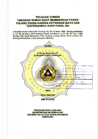 SAEPUDIN, ASEP (2009) TINJAUAN YURIDIS TINDAKAN RUMAH SAKIT MEMBIARKAN PASIEN PULANG PAKSA KARENA KETIADAAN BIAYA DAN TERPENUHINYA KUHP PASAL 304. Masters thesis, Unika Soegijapranata Semarang.