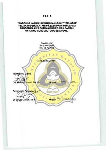 WIDIYANTO, RUDY (2012) TANGGUNG JAWAB HUKUM RUMAH SAKIT TERHADAP TINDAKAN PENGIKATAN (FIKSASI) PADA PENDERITA GANGGUAN JIWA DI RUMAH SAKIT JIWA DAERAH Dr. AMINO GONDOHUTOMO SEMARANG. Masters thesis, Unika Soegijapranata Semarang.