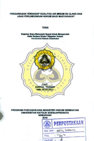 YASSER, SAEFUL (2010) PENGAWASAN TERHADAP KUALITAS AIR MINUM ISI ULANG DAN ASAS PERLINDUNGAN HUKUM BAGI MASYARAKAT. Masters thesis, Unika Soegijapranata Semarang.