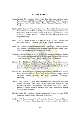 Penelitian ini menganalisis faktor-faktor yang mempengaruhi auditor switching pada semua perusahaan yang terdaftar di Bursa Efek Indonesia (BEI) tahun 2010-2015. Faktor yang diuji dalam penelitian ini antara lain ukuran KAP, ukuran perusahaan, perubahan manajemen, opini audit going concern, kompleksitas perusahaan, opini audit, fee audit, financial distress, dan perubahan ROA. Penelitian ini menggunakan metode purposive sampling dan menggunakan alat analisis multivariat dengan menggunakan regresi logistik (logistic regression). Hasil dari penelitian ini menunjukkan bahwa ukuran KAP dan perubahan manajemen memiliki pengaruh yang signifikan terhadap auditor switching. Sedangkan ukuran perusahaan, opini audit going concern, kompleksitas perusahaan, opini audit, fee audit, financial distress, dan perubahan ROA tidak memiliki pengaruh terhadap auditor switching. Kata kunci: ukuran KAP, ukuran perusahaan, perubahan manajemen, opini audit going concern, kompleksitas perusahaan, opini audit, fee audit, financial distress, perubahan ROA, dan auditor switching.