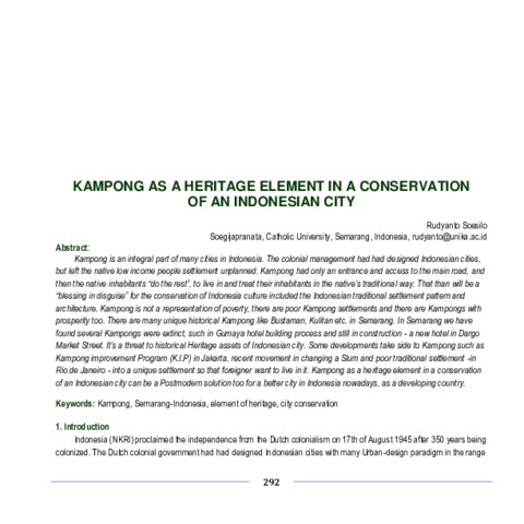 Soesilo, Rudyanto KAMPONG AS A HERITAGE ELEMENT IN A CONSERVATION OF AN INDONESIAN CITY. KAMPONG AS A HERITAGE ELEMENT IN A CONSERVATION OF AN INDONESIAN CITY. pp. 292-300.