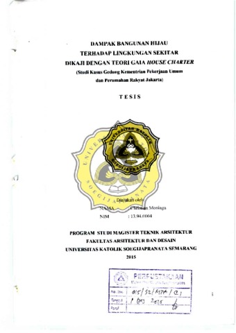 Moniaga, Christian (2015) Dampak Bangunan Hijau Tcrhadap Lingkungan Sekitar Dikaji dcngan Teori GAIA House Chater. Masters thesis, Unika Soegijapranata Semarang.