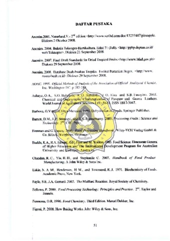 Nanas tAnanus C()IIIWlIS) rncrupakan salah satu kornoditas andalan buah ekspor Indonesia. Pembuatan nanas kcring rncrupakan salah saw alrernatif pcngolahan nanas dalam mengaruisi- pasi kelimpahan produksi maupun untuk penganekaragaman produk pangan. Atribut kualitas nanas kering dipengaruhi oleh suhu dan durasi pengeringan. Tujuan penelitian ini adalah uniuk rncngevaluasi atribut kualitas nanas kering pada bcberapa aras suhu dan durasi pcngeringan dalam cabinet dryer. Bahan utarna ) ang digunakan adalah buah nanas varietas CU) enne. Faktor perlakuan adalah suhu pcngeringan 48°C. 52uC. 56°C, 60°C. 64°C dan durasi pcngeringan 22 jam. 24 jam, 26 jam. Parameter yang diarnati adalah atribut kualitas nanas kering, yaitu : sensori (warna. aroma, rasa. tekstur). wama (lightness L·. rcdnes. a", yellowne b". pcrubahan total warna _\E. bro« ning index BI). tekstur (hardness). kadar air dan, itamin C. Hasil penelitian menunjukkan bahwa arti suhu dan durasi pengeringan mernpengaruhi atribut kualitas nanas kering Pcngeringan pad suhu 56)C dan durasi pengeringan 24 jan) rnenunjukkan perlakuan terbai dengan nilai : warn a 7.15. aroma 6,23, rasa 7.25 . tekstur 6.75. L* 72.59, a* 6.46. b" 2U 1. \E 2,77. BI 39.05. tekstur (hardness) 8,25 kgf.mrn. Kadar air 8,:20% dan vitamin C 6.17 ppm