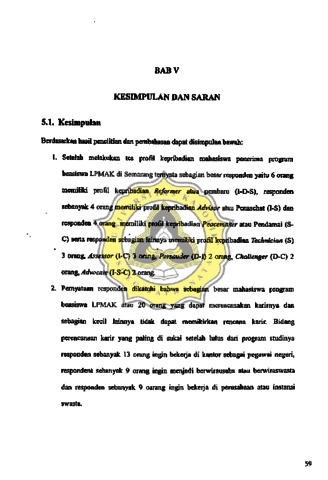 Penelitian ini bertujuan untuk mengetahui setiap profil kepribadian dan perencanaan karir. Subjek pada penelitian ini adalah mahasiswa program beasiswa LPMAK di Semarang tahun angkatan 2007-2012. Sampel yang digunakan sebanyak 31 mahasiswa dengan kriteria rnahasiswa semester IV keatas dari 45 mahasiswa program beasiswa LPMAK. Skala yang digunakan dalam penelitian ini adalah skala profil kepribadian dari konsep DiSC oleh Edysen Shin (2013) ini mengacu pada pencocokan job fit menurut konsep DiSC dengan perencanaan karir yang diisi oleh respondent. ~ ~ Hasil Penelitian ini menujukan bahwa ada 6 rnahasiswa yang tipe kepribadiannya Reformer (I-D-S) 19,36%, 4 rilahasisW'a Advisor (I-S) 12,90%, 4 mahasiswa Peacemaker (S-C) dan 3 rnahasiswa <Assessor (I-G) serta yang lainya tipe kepribadian satu dan dua orang. Sehmgga profil kepribadian individu menjadi ....- makhluk sosial yang artinya individu tidak bisa hidup sendirian dalam pekerjaan, sosial dan rumah tangga.