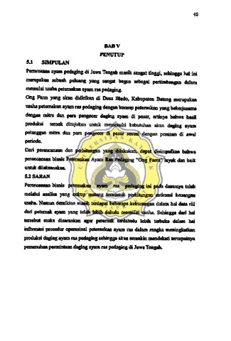 Judul skripsi yang disusun adalah " PERENCANAAN BISNIS PETERNAKAN AYAM RAS PEDAGING DI BLADO ". Yang melatarbelakangi penyusunan skripsi ini adalah selain masih terdapat peluang dalam pendirian petemakan ayam ras pedaging dilihat dari konsumsi daging ayam ras pedaging per kapita per tahun selalu mengalami peningkatan. Konsep bisnis yang dikernbangkan dalam bisnis peternakan ayam ras pedaging ini adalah sistem kontrak dengan para pengecer dan Mitra dengan kapasitas kandang 5000 ekor yang terletak di Desa Blado, Kecamatan Blado, Kabupaten Batang. perkiraan modal awal yang dibutuhkan dalam pendirian bisnis ini sebesar Rp 400.000.000,00 Berdasarkan perhitungan analisis kelayakan pada aspek keuangan, seperti NPV dan IRR menunjukkan hasil bahwa bisnis petemakan ayam ras pedaging ini dikategorikan "LAYAK" untuk dijalankan dengan tingkat PI sebesar 1,3 pada kondisi normal.