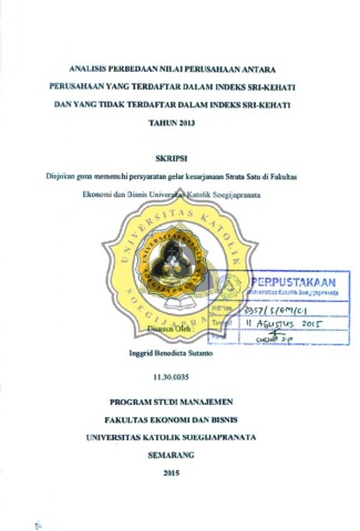 Sutanto, Inggrid Benedicta (2015) ANALISIS PERBEDAAN NlLAI PERUSAHAAN ANTARA PERUSAHAAN YANG TERDAFfAR DALAM INDEKS SRI-KEHATI DAN YANG TIDAK TERDAFTAR DALAM INDEKS SRI-KEHATI TAHUN 2013. Other thesis, UNIKA SOEGIJAPRANATA SEMARANG.