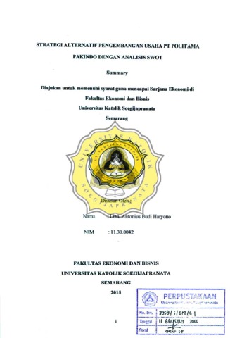 Haryono, Lian, Antonius Budi (2015) STRATEGI ALTERNATIF PENGEMBANGAN USAHA PT POLITAMA PAKINDO DENGAN ANALISIS SWOT. Other thesis, UNIKA SOEGIJAPRANATA SEMARANG.
