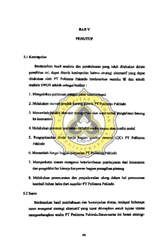 Penelitian ini berisi tentang strategi-strategi altematif apa saja yang bisa digenerasikan oleh PT Politama berdasarkan kekuatan, kelemahan, peluang, dan ancaman yang dimiliki PT Politama Pakindo dengan analisis SWOT. PT Politama Pakindo adalah sebuah anak perusahaan karung plastik yang terletak di jalan Desa Gedanganak, Ungaran, Semarang. Metode penelitian dalam penelitian ini menggunakan metode deskriptif kualitatif. Sampel penelitian ini berjumlah 10 orang responden yang terdiri dari 5 orang responden konsumen bisnis PT Politama dan 5 orang responden pihak manajemen PT Politama. Sumber data yang dipakai dalam peneliitian ini terdiri dari data primer yang diperoleh dengan teknik kuesioner dan wawancara langsung dengan responden yang bersangkutan dan data sekunder yang diperoJeh dari catatan-catatan dan dokumen PT Politama Pakindo. Hasil dari penelitian ini berupa strategi-strategi altematif yang bisa diterapkan oleh PT Politama Pakindo berdasarkan analisis SWOT dengan dasar pertimbangan kekuatan, kelemahan, peluang, serta ancaman yang dihadapi PT Politama