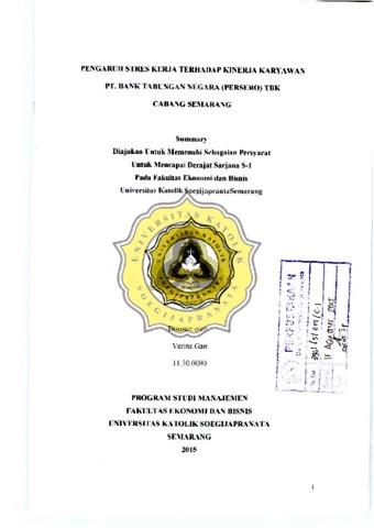 Gan, Verina (2015) PENGARUH STRES KERJA TERHADAP KINERJA KARYAWAN PT. BANK TABUNGAN NEGARA 9PERSERO0 TBK CABANG SEMARANG. Other thesis, UNIKA SOEGIJAPRANATA SEMARANG.