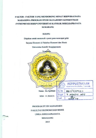 Apriliani, Ira (2015) FAKTOR-FAKTOR YANG MENDORONG MINAT BERWIRAUSAHA MAHASISWA PROGRAM STUDI MANAJEMEN KONSENTRASI ENTREPRENEURSHIP UNlVERSITAS KATOLIK SOEGIJAPRANA TA SEMARANG. Other thesis, UNIKA SOEGIJAPRANATA SEMARANG.