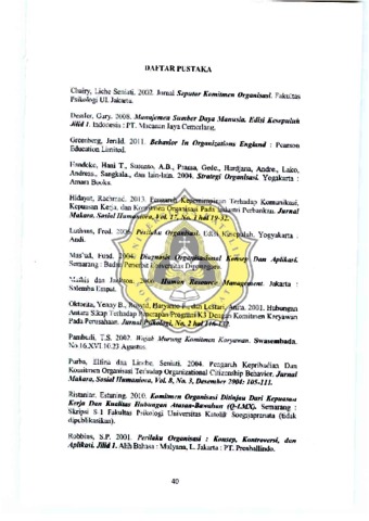 Penelitian ini bertujuan unruk mengctahui komitmen organisasional karyawan "Gracia Skin Clinic" Sernarang menu rut tcori Allen dan Meyer yang merruliki tigu bcntuk kornitrnen organisasional yairu Affective Commitment, Continuance Commitment. Normative Commitment, dan uniuk mernberikan u ulan pcrbaikan bagi "Gracia Skin Clinic" Semarang dalam mcningkatkan kormrmcn organisasional karyawannya. Lekas: t1JIJJ11 pcncluian ini adalah Ji jalan Pandanaran 1 no 29A Scmarang. Sampcl yang digunakan yairu scmua karyawan "Gracia Skin Clinic" Sernarang sebanyak 31 orang karyaw an . Merodc anahsis yang digunakan adalah rnetode analisis dcskriptif Mctode pengumpulan data pada penehtian ini adalah kuesioncr dan W3W(lnCar3. Kuesioncr dibagikan kepada scrnua karyawan "Gracia Skin Clinic" Semar.ing sebanyak 32 orang dan wawancara dilakukan pada ~ karyawan "Gracia Skin Clinic" emarang yang rnerniliki kriteria wakru bckerja paling lama. Hasil dalarn penelirian 1111 menyatakan bahwa k mil men organisasional karyawan "Gr3 it! Skin Chnic' Scmarang mcrniliki karegori yang tinggi pada Affective Communi: J1', 'dan karegcri scdang 1":1..13 Continuance Commitment dan Normative Commitment. Usulan perhai can bagi "Gracia Skin Clinic" Sernarang dalarn meningkatkan konutmcn organisasional karyawannya adalah Affective Commitment dengan cara mcndaftarkan semua karyawan pada BP 1S: Continuance Commitment deng.in cara rnerunjau kernbali jumlah kornpensasi langsung yang berupa gaji pokok Q.lI1 membcrikan tunjangan transport: Vormari\'e Commitment dengan mengadakan [raining mcngcnai kes daran dan pengetahuan tentang etika berorgani sasi.